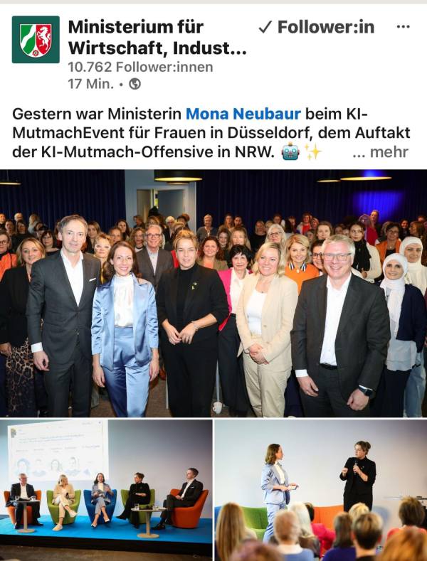 View Larger Image LinkedIn: Mona Neubaur beim Auftakt der KI-Mutmach-Offensive in NRW By Admin21|4. November 2025|Presse|Kommentare deaktiviert für LinkedIn: Mona Neubaur beim Auftakt der KI-Mutmach-Offensive in NRW Share This Story, Choose Your Platform! FacebookXBlueskyRedditLinkedInWhatsAppTelegramTumblrPinterestXingEmail About the Author: Admin21 Related Posts Rheinische Post: Digitale Zukunft darf kein Privileg sein Express Düsseldorf: Anja Bezold will Frauen fit für die KI machen VierNull – Anja Bezold macht KI zur Frauensache Rheinische Post – „KI darf kein Männerprojekt bleiben“